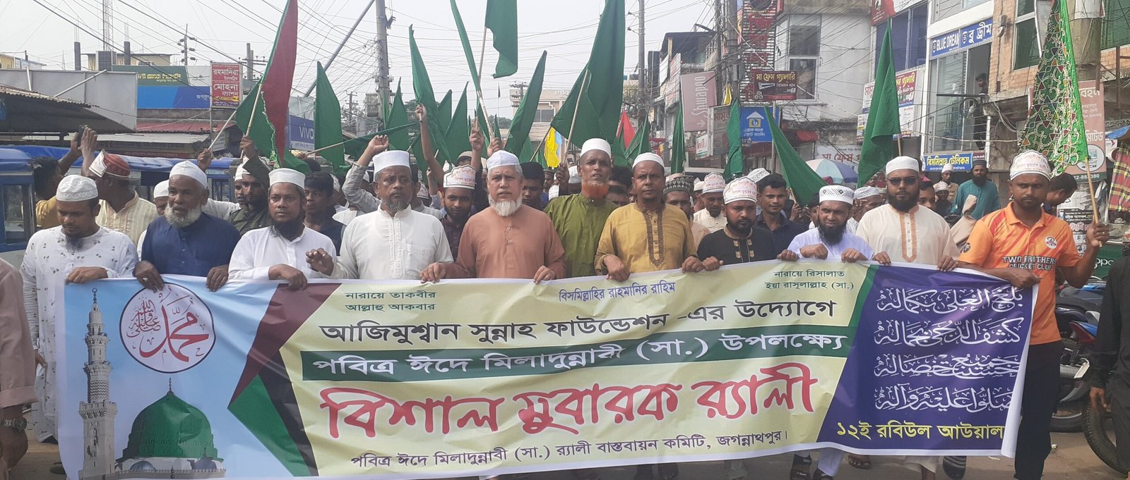 স্টাফ রিপোর্টারঃ- জগন্নাথপুরে পবিত্র ঈদে মিলাদুন্নবী (সাঃ) উপলক্ষে আজিমুশ্বান সুন্নাহ ফাউন্ডেশনের উদ্যােগে পবিত্র ঈদে মিলাদুন্নাবী (সাঃ) উপলক্ষে বিশাল মুবারক র্যালি