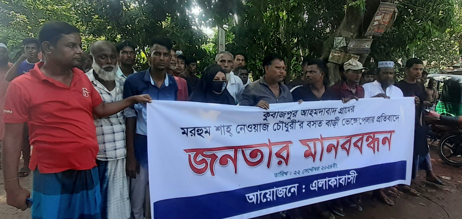 জগন্নাথপুরে শাহ নেওয়াজ চৌধুরীর বাড়ি ভেঙ্গে ফেলার প্রতিবাদে মানববন্ধন