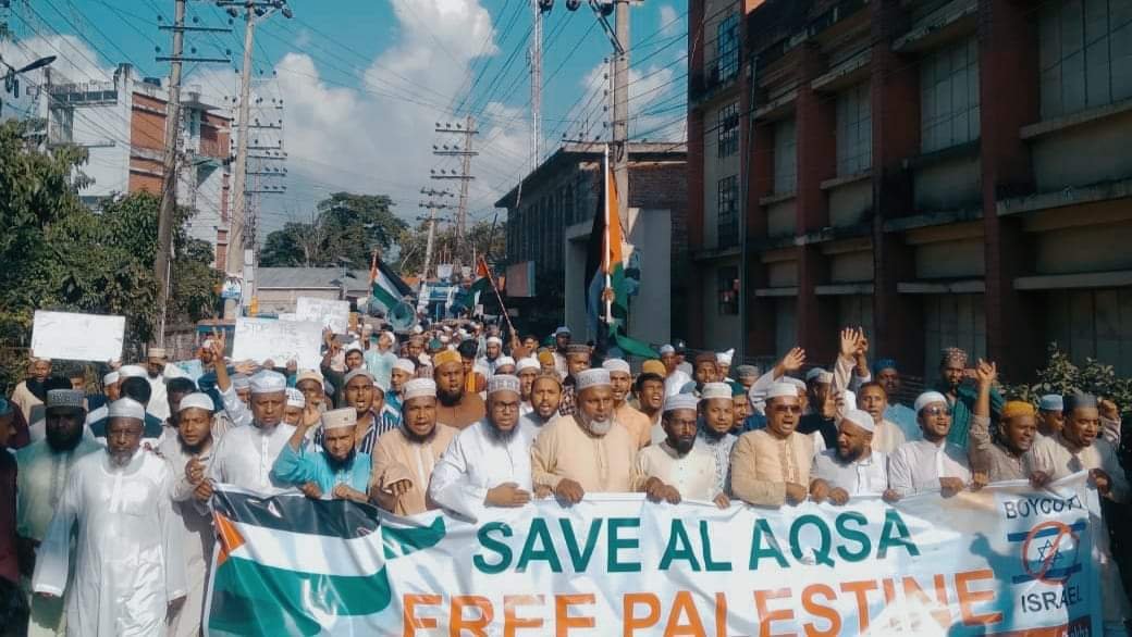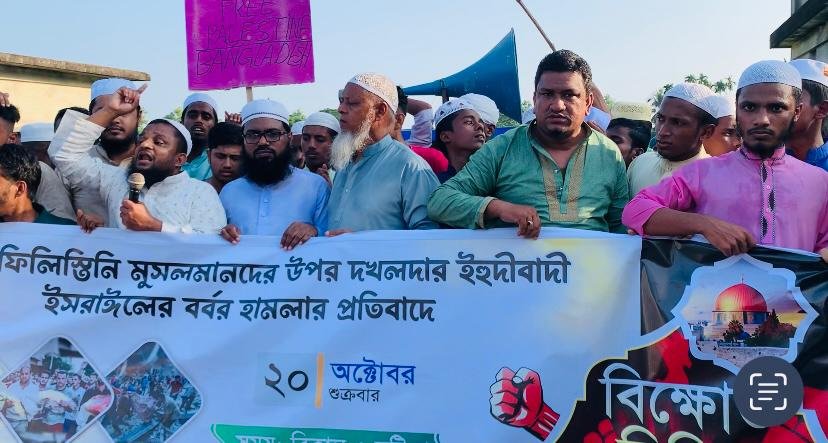 জগন্নাথপুরের মিরপুরে ফিলিস্তিনি মুসলমানদের গণহত্যার প্রতিবাদে বিশাল বিক্ষোভ মিছিল প্রতিবাদ সমাবেশ অনুষ্ঠিত