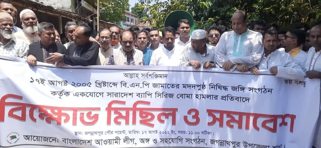 স্টাফ রিপোর্টার:- ২০০৫ সালে ১৭আগষ্ট বিএনপি জামায়াত কর্তৃক দেশব্যাপী সিরিজ বোমা হামলার প্রতিবাদে জগন্নাথপুর উপজেলা আওয়ামী লীগ ও সহযোগি সংগঠনের