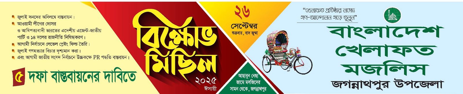 বাংলাদেশ খেলাফত মজলিস জগন্নাথপুর উপজেলা শাখার উদ্যোগে আগামীকাল ২৬ সেপ্টেম্বর ২০২৫ ইং শুক্রবার বাদ জুমা কেন্দ্র ঘোষিত ৫দফা বাস্তবায়নের দাবীতে