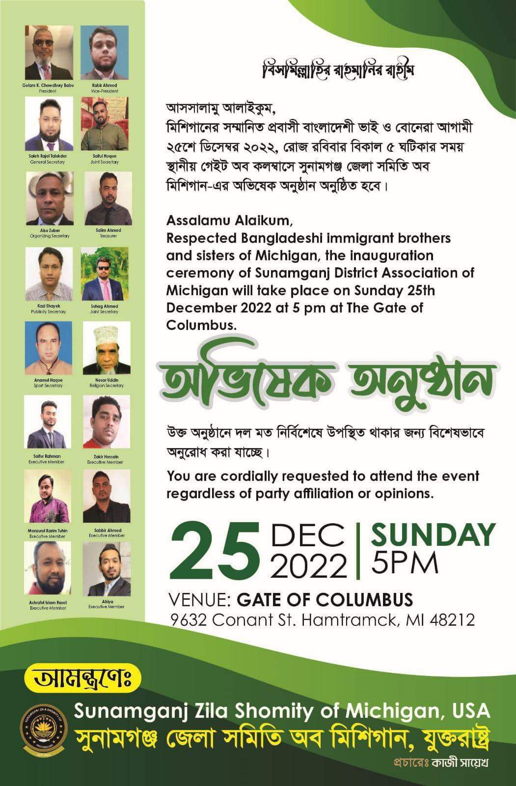 সুনামগঞ্জ জেলা সমিতি অব মিশিগান – এর অভিযেক ২৫ ডিসেম্বরঃ-জগন্নাপুর টুডে;