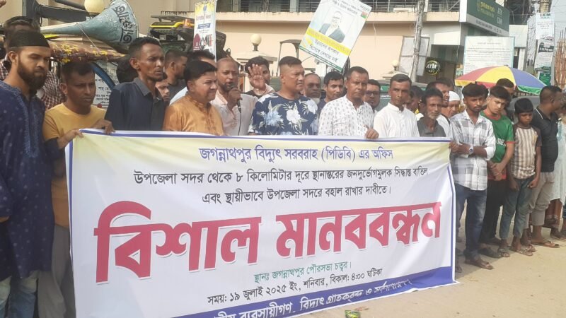 জগন্নাথপুর বিদ্যুৎ সরবরাহ পিডিবি এর অফিস উপজেলা সদর হতে ৮কিলোমিটার দূরে স্থানান্তরের জনদূর্ভোগমূলক সিন্ধান্ত বাতিল ও সদরে বিদ্যুৎ অফিস বহাল রাখার দাবীতে বিশাল মানববন্ধন কর্মসূচী পালন করা হয়েছে।