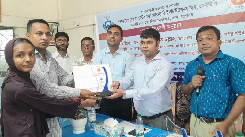 পারফরমেন্স বেজড গ্র্যান্ডস ফর সেকেন্ডারি ইন্সটিটিউশনস স্কিম, এসইডিপি, মাধ্যমিক ও উচ্চ শিক্ষা অধিদপ্তর, শিক্ষা মন্ত্রনালয় কর্তৃক জগন্নাথপুরে ২০২২-২০২৩ সালে এসএসসি ও এইচএসসি উত্তীর্ণ শিক্ষার্থীদের মাঝে পুরস্কার বিতরন করা হয়েছে।